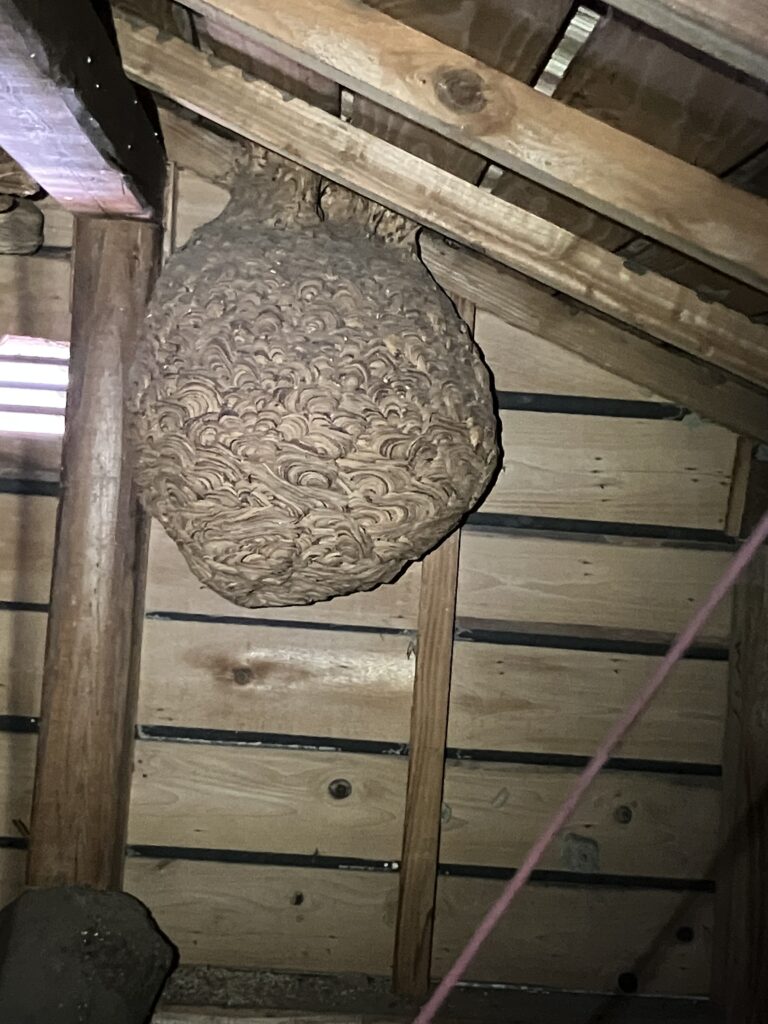 とりあえず調べてみようと天井裏に上がって痕跡を探していると、いきなり目の前に大きなスズメバチの巣が!