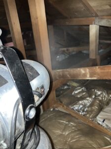 前の週に殺菌消毒・届く範囲ですが糞や木粉などの清掃・消臭・殺虫剤散布・粘着トラップの設置・追出しの燻煙処理まで行いまして、本日は天井裏のチェックからスタートです。